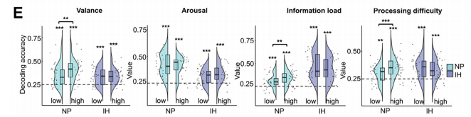 研究运用了表征相似性分析(RSA)这一前沿解码技术。RSA分析结果显示,在自然状态下,大脑对不同刺激特征(如情绪效价、唤醒度、信息量等)会产生清晰、可区分的神经活动模式,在表征矩阵上呈现为高度结构化的彩色图案。然而,一旦进入主动抑制状态,这些原本清晰的神经表征模式便被显著“解耦”,结构化的图案迅速变得混乱无序,趋近于随机噪音(图5)。这表明,大脑顺利获得主动抑制,有效“模糊”了输入信息的神经“指纹”,使其难以被清晰地识别和加工。