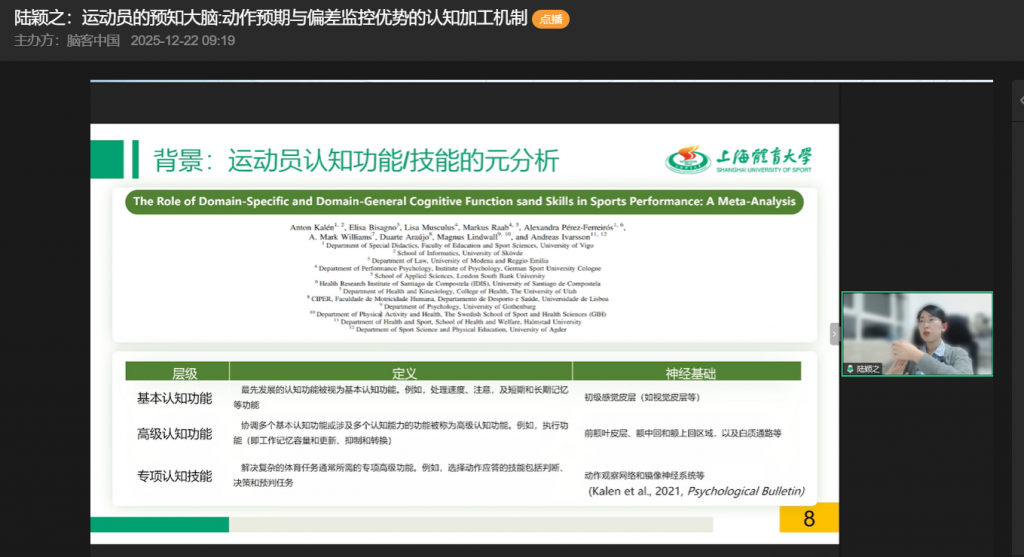 12月17日晚,脑客中国科研直播特邀上海体育大学心理学院陆颖之教授,带来“运动员的预知大脑:动作预期与偏差监控优势的认知加工机制”主题报告,从专业视角揭开了运动员认知优势的神秘面纱。报告围绕研究背景、核心机制、实验发现及应用方向展开,辅以严谨数据分析与生动案例,为观众呈现了一场高质量的内容分享。