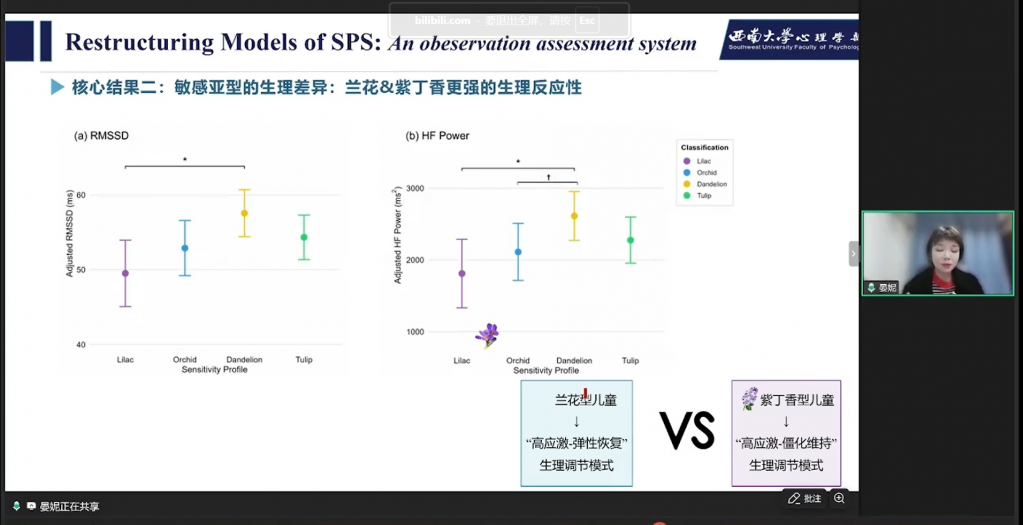 基于新工具研究,得出核心结果:两类高敏感亚型——高敏感兰花vs高敏感紫丁香,表现出对物理刺激和社会刺激的易激惹性不一样;敏感亚型的生理差异,紫丁香型生理反应调节性最差,表现出比较“僵化”的生理调节模式;敏感亚型存在不同的“环境易感性”,在内外化问题、抑制控制、认知灵活性等路径存在显著的组间差异。